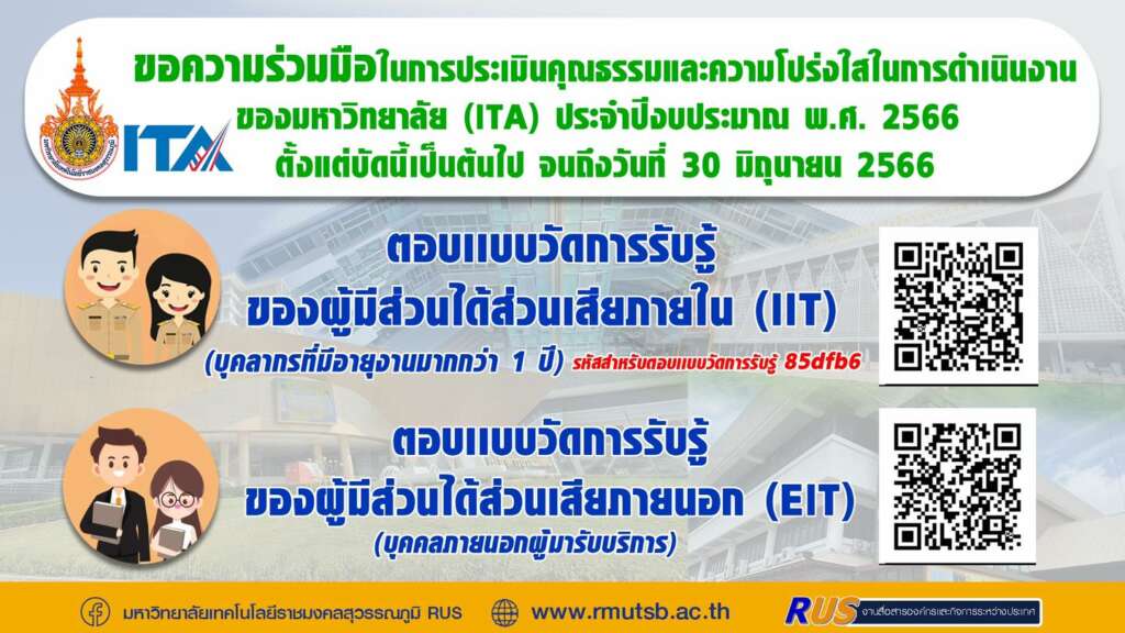 การประเมิน ITA การประเมินคุณธรรมและความโปร่งใสในการดำเนินงานของหน่วยงานภาครัฐ คู่มือการประเมินคุณธรรมและความโปร่งใสในการดำเนินงานของหน่วยงานภาครัฐ ประจำปีงบประมาณ พ.ศ. 2566 (Download File)มาตรการส่งเสริมคุณธรรมและความโปร่งใสภายในหน่วยงานการประเมินคุณธรรมและความโปร่งใสในการดำเนินงานของหน่วยงานภาครัฐ (ITA) ประจำปีงบประมาณ พ.ศ.2566 (Download File) ขอเชิญผู้มีส่วนได้ส่วนเสียหรือผู้ติดต่อรับบริการกับคณะเทคโนโลยีการเกษตรและอุตสาหกรรมเกษตร มหาวิทยาลัยเทคโนโลยีราชมงคลสุวรรณภูมิ ตอบแบบวัดการรับรู้ของผู้มีส่วนได้ส่วนเสียภายใน (IIT) ตอบแบบวัดการรับรู้ของผู้มีส่วนได้ส่วนเสียภายนอก (EIT) สมารถตอบแบบวัดการรับรู้ได้โดยคลิกหัวข้อด้านล่าง –ตอบแบบวัดการรับรู้ของผู้มีส่วนได้ส่วนเสียภายใน (IIT) –ตอบแบบวัดการรับรู้ของผู้มีส่วนได้ส่วนเสียภายนอก (EIT)